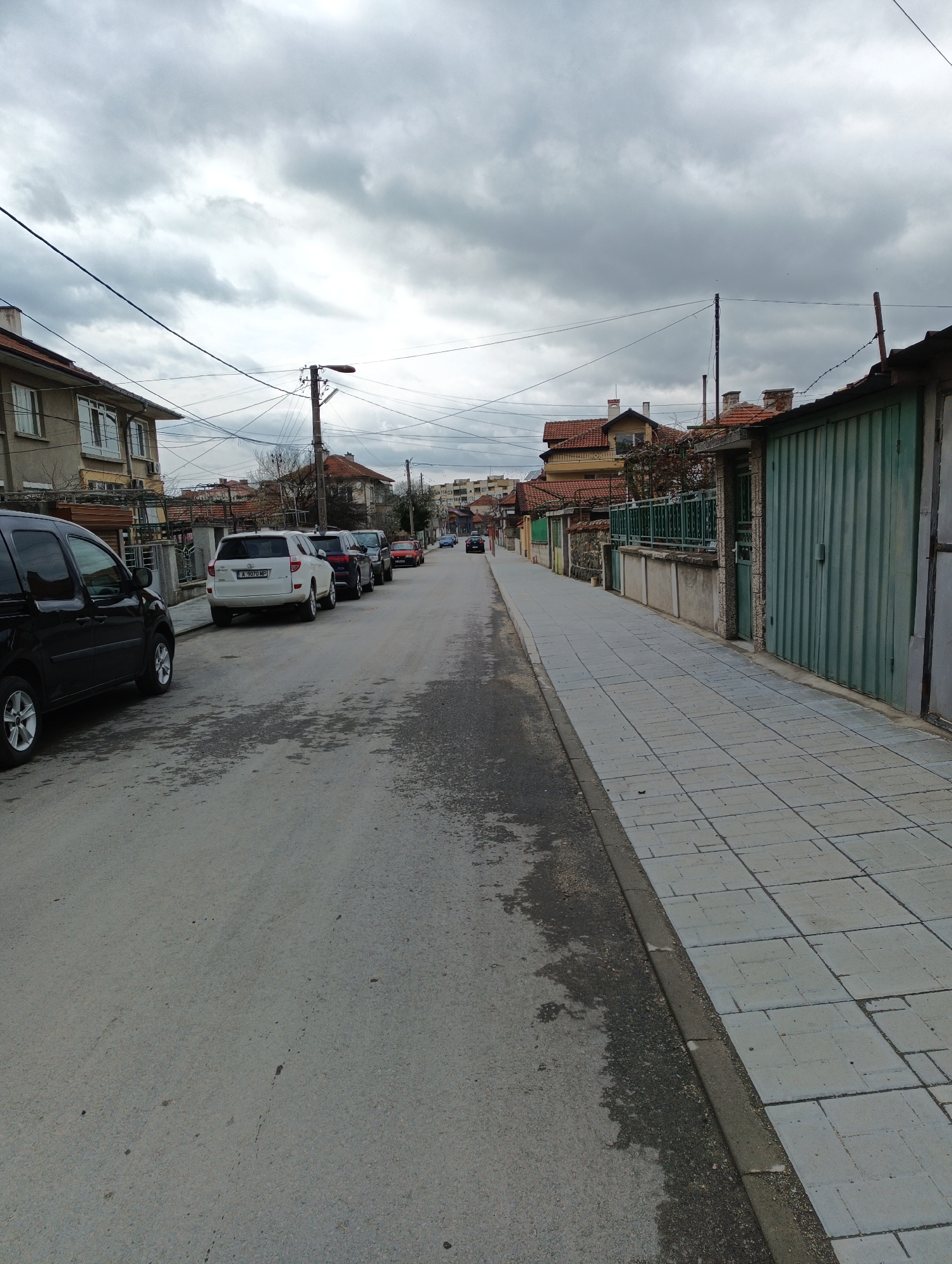 The image depicts a street scene in Karnobat, Bulgaria, characterized by overcast skies. The street is flanked by a concrete sidewalk on the right and parked vehicles on the left. A black van is parked on the left, followed by several other vehicles, including a white SUV. On the right side of the street, a row of buildings and fences lines the sidewalk, including some green corrugated metal structures. Power lines are visible overhead. The road surface is asphalt, showing some wear and tear. Further down the street, more buildings can be seen in the distance. The scene appears quiet and still, without any visible people or immediate activity.