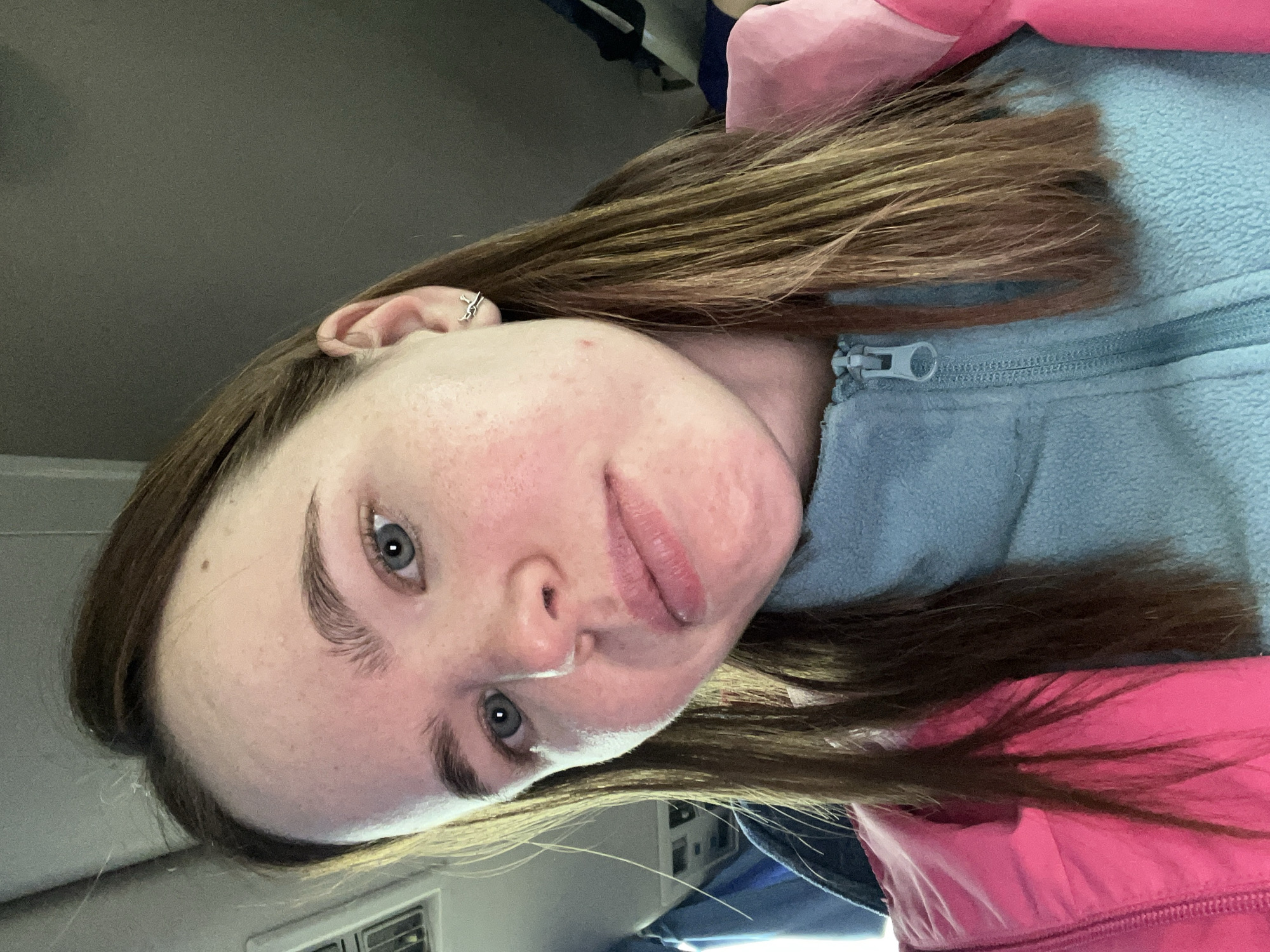 A young woman with light brown hair and fair skin is pictured from a close, slightly angled perspective