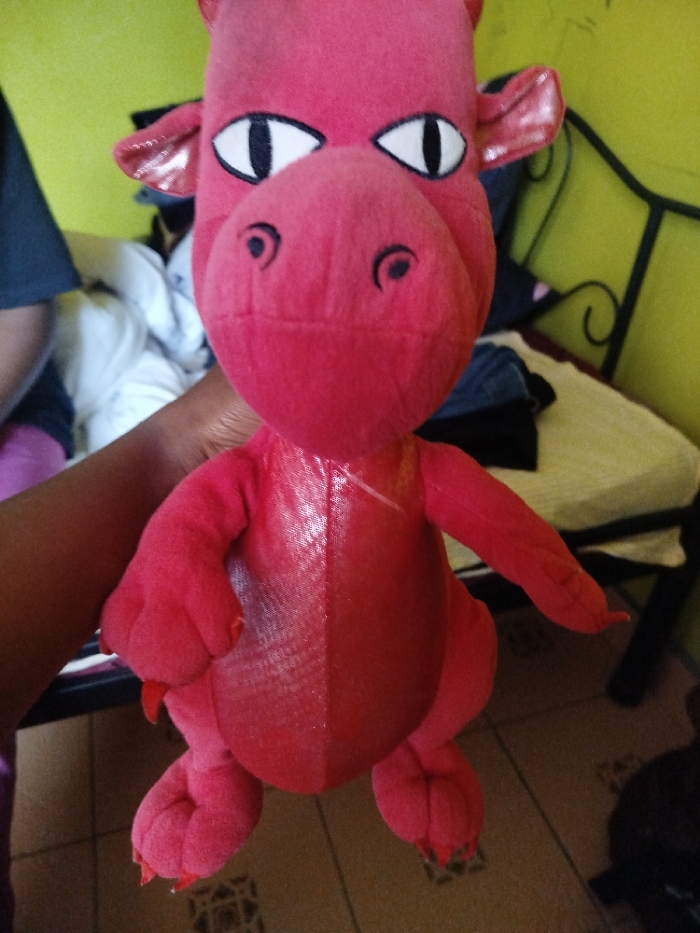 - "A red plush toy, resembling a dragon with white oval eyes and black slit pupils, is held centrally by a dark-skinned human hand and forearm" by FM-gef792, licensed under CC BY 4.0