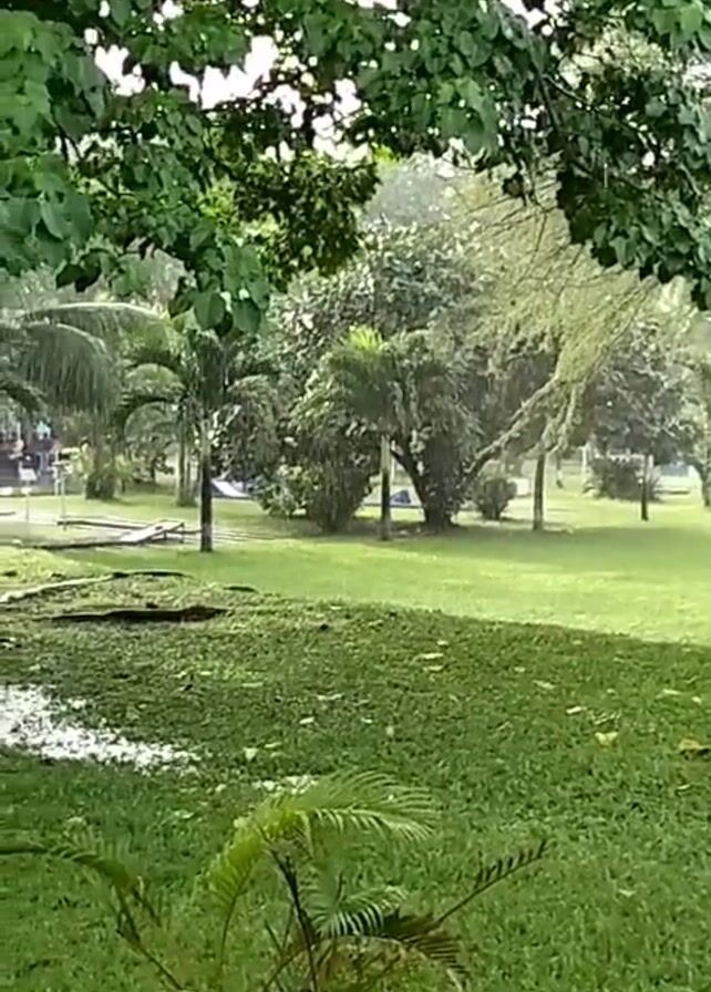 lush green park under a heavy rain. The camera is positioned under the shade of a large tree, with its leaves providing a partial frame at the top of the shot. The park features well-maintained grassy areas interspersed with various trees, including palm trees and other leafy species. Raindrops are visible as they fall heavily across the scene, creating a blurry effect in the distance. A playground area is slightly visible in the background. There is also a dark, damp area on the lawn in the foreground where rainwater has collected, creating a contrast against the brighter green grass. The colors are vibrant, emphasizing the greenery and wetness of the environment. A glimpse of an individual in a dark shirt appears briefly in the lower left corner.
