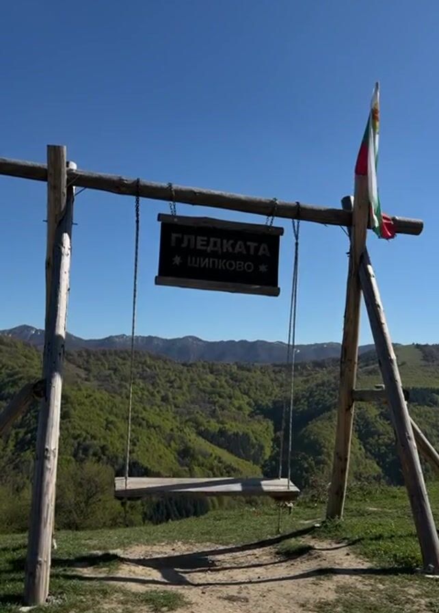 static, ground-level shot of a wooden swing set against a clear blue sky. A Bulgarian flag flutters gently from the right support of the swing set. A black sign with white lettering hangs above the swing, displaying the words "ГЛЕДКАТА" and below that "* ШИПКОВО *." The swing is made of a single wooden plank suspended by chains. The backdrop is a view of green, forested mountains stretching into the distance. The ground around the swing set is a mix of dirt and short green grass. There are no people visible in the frame, and no activities are taking place.