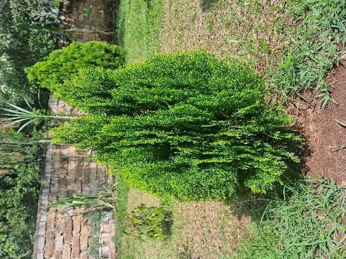 This image depicts an outdoor garden scene in Muthambi ward, Kenya. A prominent, vibrant green, conical evergreen shrub stands centered in the foreground, with its base surrounded by a mix of green grass and exposed reddish-brown soil. To the right in the mid-ground, a second, smaller, similarly shaped green evergreen shrub is visible. A dry-stacked stone wall forms the background, extending horizontally across the frame. Behind the left section of the wall, several small plants in white pots are arranged. Tall, green, reed-like plants, possibly sugarcane, are visible behind the wall to the right, along with other green foliage. A small, sparsely leafed shrub is situated to the left of the main foreground evergreen. The scene is illuminated by natural sunlight, casting subtle shadows. No people are present.