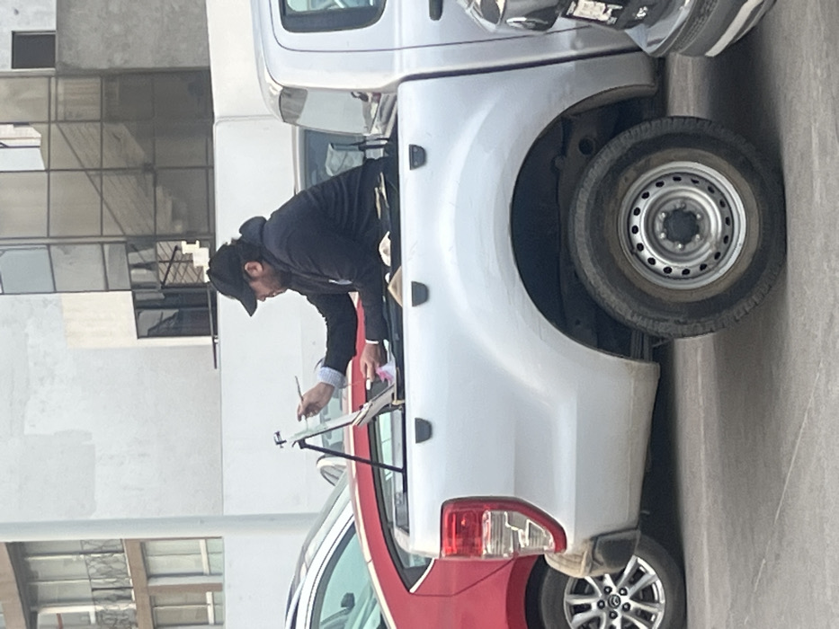 A person in a black hoodie and cap leans into the open passenger window of a red pickup truck, writing on a document attached to a clipboard. The truck is parked adjacent to a white pickup truck. The rear passenger wheel of the white truck is visible, as is the exterior spare tire. A mirrored building is visible in the background, as is concrete.