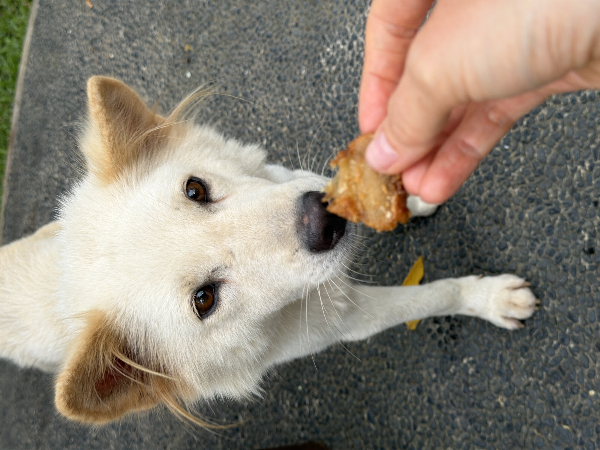 A cream-colored dog with tan markings on its ears stands on a dark, pebbled ground surface in Tegal Suci, Indonesia. The dog, positioned centrally, looks upward with dark brown eyes towards a small, irregularly shaped piece of fried, golden-brown food. A human right hand, with light skin, holds the food between the thumb and forefinger, extending it towards the dog's snout. The dog's black nose is in close proximity to the food. A single yellow leaf rests on the ground near the dog's front left paw. Blurred green foliage is visible in the upper right background.