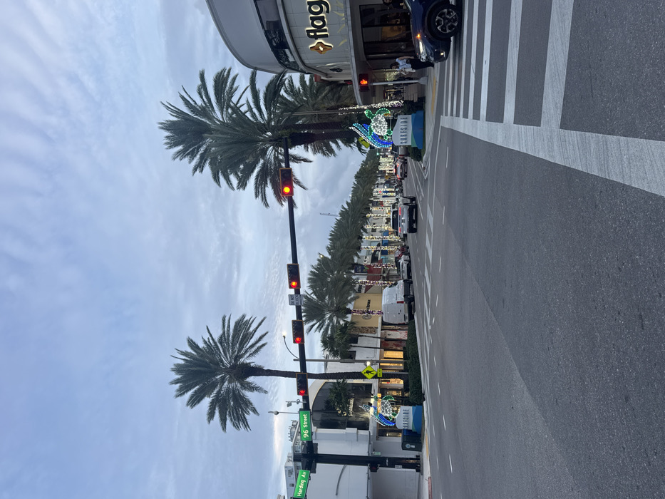 A street scene shows palm trees lining both sides of a road with cars parked along the edge. Traffic lights are red, and there's a pedestrian crosswalk. Buildings and businesses flank the road. Street signs indicate Harding Avenue and 96th Street. A bright blue and white sign labeled "SURFSIDE" with an illuminated sculpture is near the crosswalk. A building with the word "flag" is visible in the background.