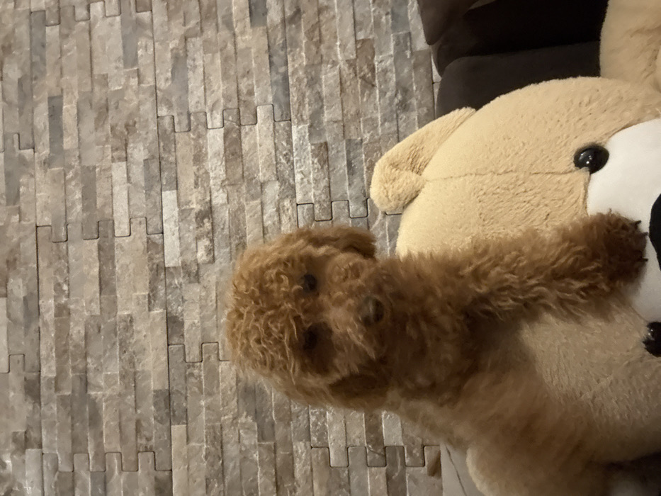 - "The image presents an indoor scene featuring a small, light brown, curly-haired dog, resembling a poodle, positioned on top of a large, plush, light tan teddy bear" by FM-rl30F2, licensed under CC BY 4.0