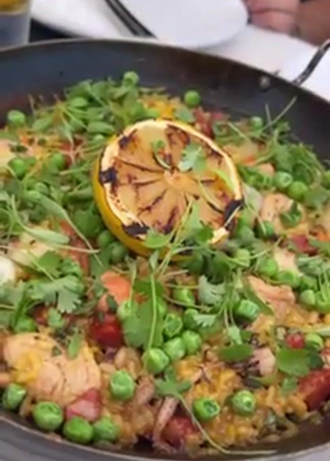 Here is a detailed description of the video: The video opens with a close-up shot of a paella dish served in a large, shallow pan