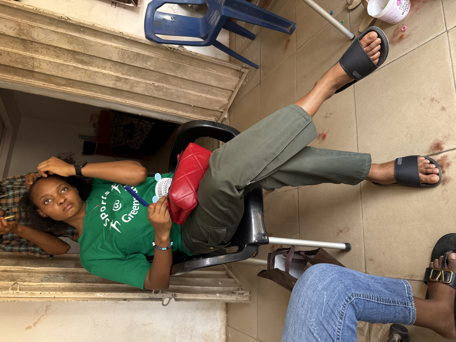 An indoor scene depicts a hair styling session. The precise location within Abuja, Nigeria, cannot be determined from visual information, but the environment is consistent with a casual salon or a home setting. **Subjects:** 1. **Primary Individual:** A female, estimated 20-30 years old, with dark skin, seated in a black plastic chair. She wears a green t-shirt with "sports @ Green..." text, olive green cargo pants, and black slides. Her dark hair is partially styled, with some sections braided and others loose. She looks forward with a neutral expression. Her left hand is raised near her scalp; her right hand holds a small blue and white handheld fan and a blue pen. A red quilted handbag rests on her lap. She wears a blue beaded bracelet on her left wrist and a black watch on her right. 2. **Hair Stylist:** Partially visible behind the primary individual, wearing a plaid shirt. Their hands are positioned at the primary individual's head, actively engaged in braiding or styling her hair with a hair tool. 3. **Third Individual (Partial):** In the lower-left foreground, only the lower torso and legs are visible, wearing blue denim jeans and dark sandals with a gold buckle, seated on a lower surface. **Objects:** - A black plastic chair occupied by the primary individual. - A blue plastic chair is visible in the right background. - A red quilted handbag is on the primary individual's lap. - A small blue and white handheld fan and a blue pen are held by the primary individual. - A brown fabric bag is on the floor to the left. - A white plastic container (possibly hair product) is on the floor to the right. - Multiple small pink/red hair accessories or beads are scattered on the floor. **Environment:** - The floor is covered with light-colored ceramic tiles, exhibiting several red/pink stains or spills, particularly under the primary individual's feet and near the white container. - The background features a light-colored wall or doorway to the left. - To the right, a large, vertical, light brown corrugated metal door or partition is visible. - Through an opening in the background, a dimly lit interior room with dark-colored furniture is discernible. - Illumination appears to be ambient, casting soft shadows. **Actions and Interactions:** The hair stylist is actively working on the primary individual's hair. The primary individual is seated, holding a fan and pen, with her hair in the process of being styled. The third individual is present, seated nearby.
