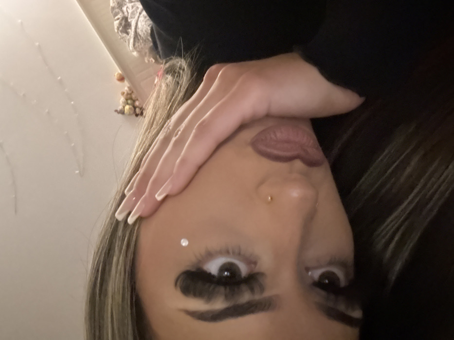 A face is visible, tilted sideways, with eyes wide. Dramatic eyelashes are prominent. A shiny jewel is placed near one eye. The lips are painted with a matte color. A nose piercing is visible. A hand with long, white-tipped nails covers part of the forehead. The person appears to be wearing a dark-colored top. Light blonde hair is visible. Some fuzzy objects are in the top left corner.