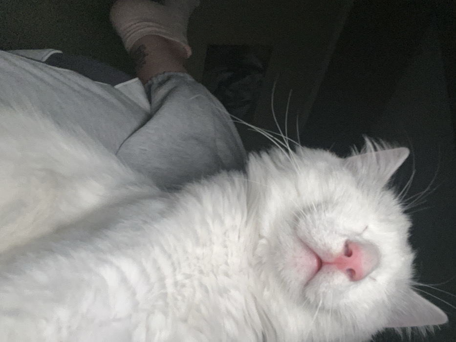 The scene depicts a domestic cat resting on a person within a dimly lit indoor environment in Yoakim Gruevo, Bulgaria. The central subject is a white-furred cat, facing slightly upwards with its eyes closed, mouth slightly open, and a prominent pink nose. White whiskers extend from its muzzle. The cat's fur covers a portion of a human's body, specifically a leg or arm section clad in a light grey long-sleeved garment, possibly a sweatshirt. A human foot or ankle, wearing a light pink sock, is partially visible to the left of the cat, featuring a dark tattoo on the ankle area. The background is dark and out of focus, with an indistinct dark shape visible on the far left. The cat appears to be in a relaxed state, possibly sleeping, on the human's lap or chest.