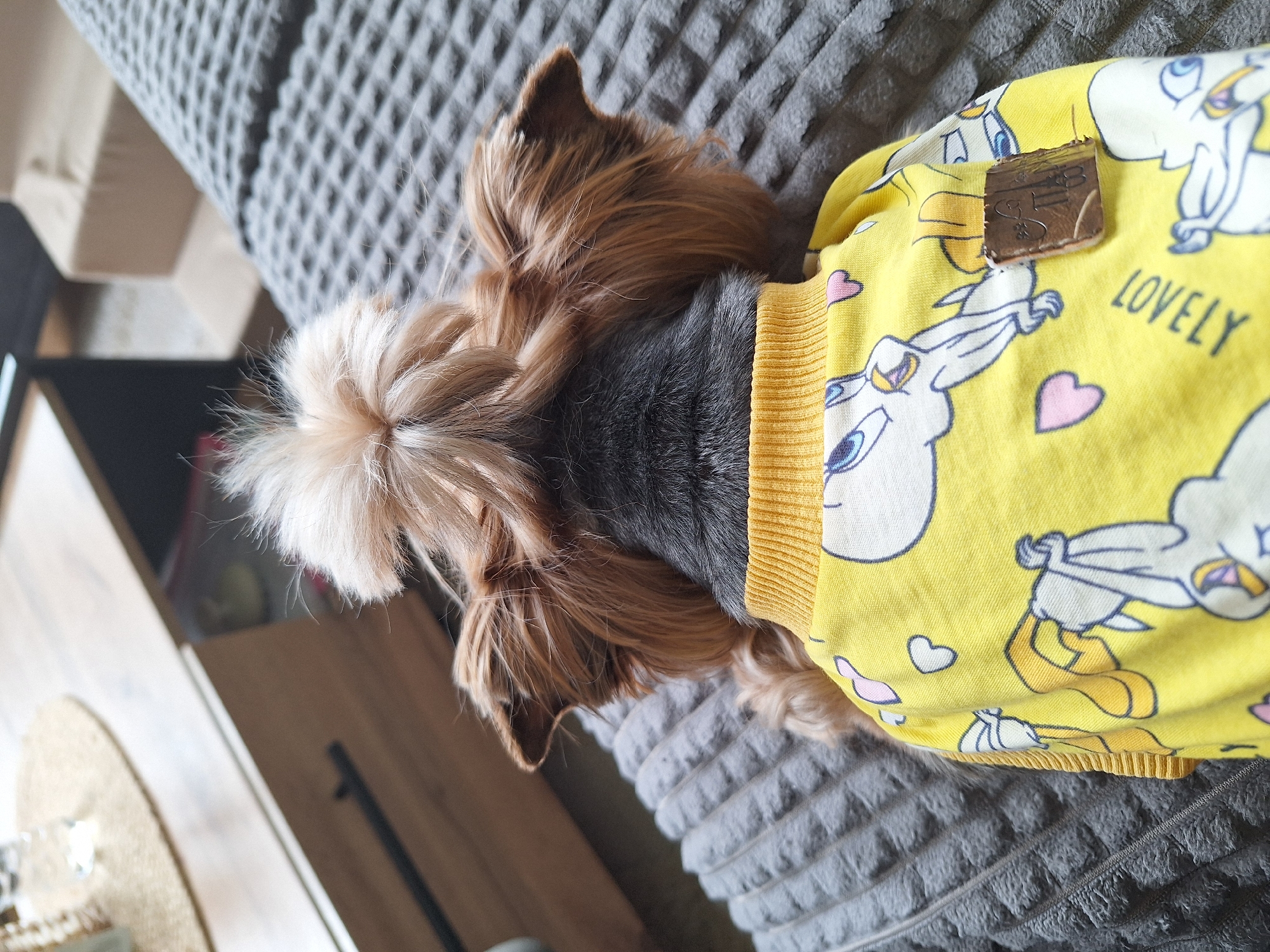A small domestic canid, viewed dorsally, is positioned on a textured, grey waffle-patterned blanket. The animal exhibits bi-colored fur; a dark grey coat covers its back and upper neck, transitioning to light brown fur on its ears and sides of the head. A prominent topknot of light blonde hair is styled on the animal's head. The canid is wearing a bright yellow long-sleeved garment, likely a sweater or pajamas, featuring a ribbed yellow collar. The garment is patterned with repeating white and blue cartoon avian characters (resembling Tweety Bird) and small pink heart motifs. The word "LOVELY" is printed on the garment in an inverted orientation. A small, rectangular, dark brown patch, possibly leather, with faded markings, is affixed to the right side of the garment. In the background to the left, a light brown wooden furniture piece, possibly a cabinet or table, is partially visible, featuring a dark horizontal handle. On this surface, a circular, light-colored woven placemat holds a clear glass and other indistinct objects. To the right and rear of the animal, a section of light-colored, upholstered furniture, such as a sofa or chair, is discernible. The scene is an interior domestic setting. The location in the city of Montana, Bulgaria, is not discernible from the provided image data.