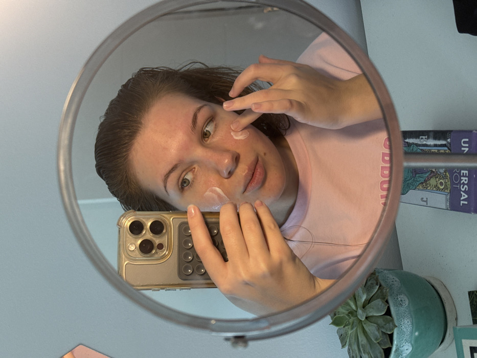 An individual is depicted in a selfie taken via a smartphone reflected in a round, framed tabletop mirror in Vozdovac Urban Municipality, Serbia. The person, appearing to be a young female, has medium-brown hair pulled back and is wearing a light pink crew-neck t-shirt. Her left hand holds a transparent-cased iPhone with a grey grip accessory, pointed towards her reflection. Her face shows several small dabs of white cream, and her right hand's index and middle fingers are actively blending the cream into her right cheek/temple area. Her gaze is directed slightly upwards and to her right. In the lower-left quadrant of the mirror's reflection, a green succulent plant in a teal ceramic pot on a white saucer is visible on a white surface. To the right of the plant, partially obscured, are inverted text elements and images from what appears to be a book or a stack of tarot cards with a purple spine, also on the white surface. The background reflected behind the individual is a plain, light blue or light grey wall.