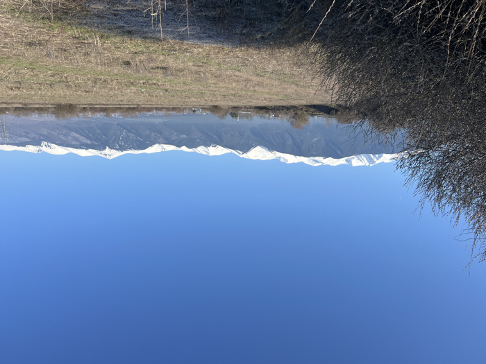 The image displays a panoramic landscape identified as Bania, Bulgaria, under a clear, bright blue sky. A range of snow-capped mountains dominates the background, extending horizontally across the frame. Their lower slopes appear darker, with a faint haze obscuring the immediate base. In the mid-ground, a wide, flat, dry field with sparse, brown vegetation extends towards the mountain range. The foreground on the left is occupied by a dense, leafless bush or shrub with intricate, dark branches. A power line pylon is partially visible on the far right, near the base of the mountains, with a small, indistinct structure appearing further left in the mid-ground. The overall lighting suggests daylight, with some areas of the field in shadow or possibly covered in frost in the immediate foreground. No individuals, overt actions, or interactions are present in the scene.