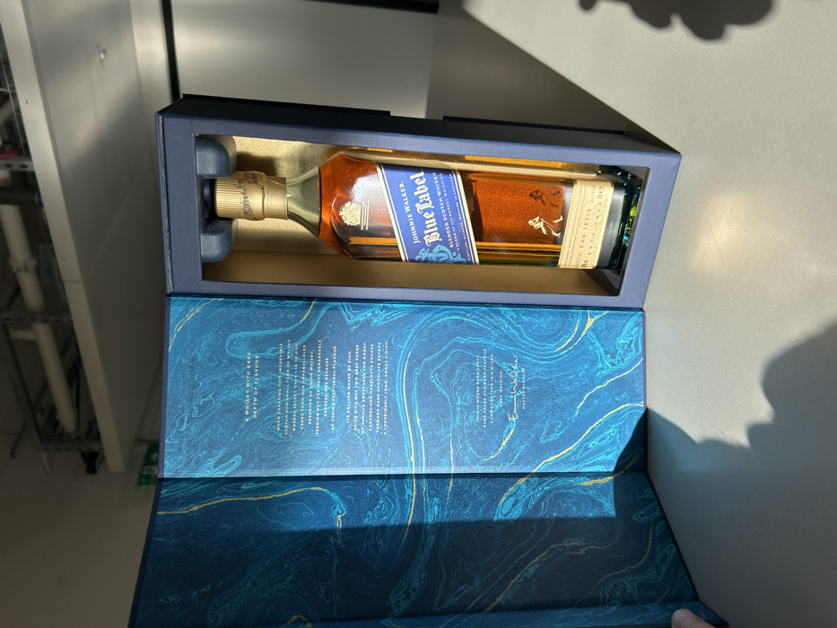 - "A bottle of Johnnie Walker Blue Label Blended Scotch Whisky is displayed upright within its open, two-part presentation box on a light grey surface in an indoor commercial setting in the City of London, United Kingdom" by FM-q2mpF2, licensed under CC BY 4.0