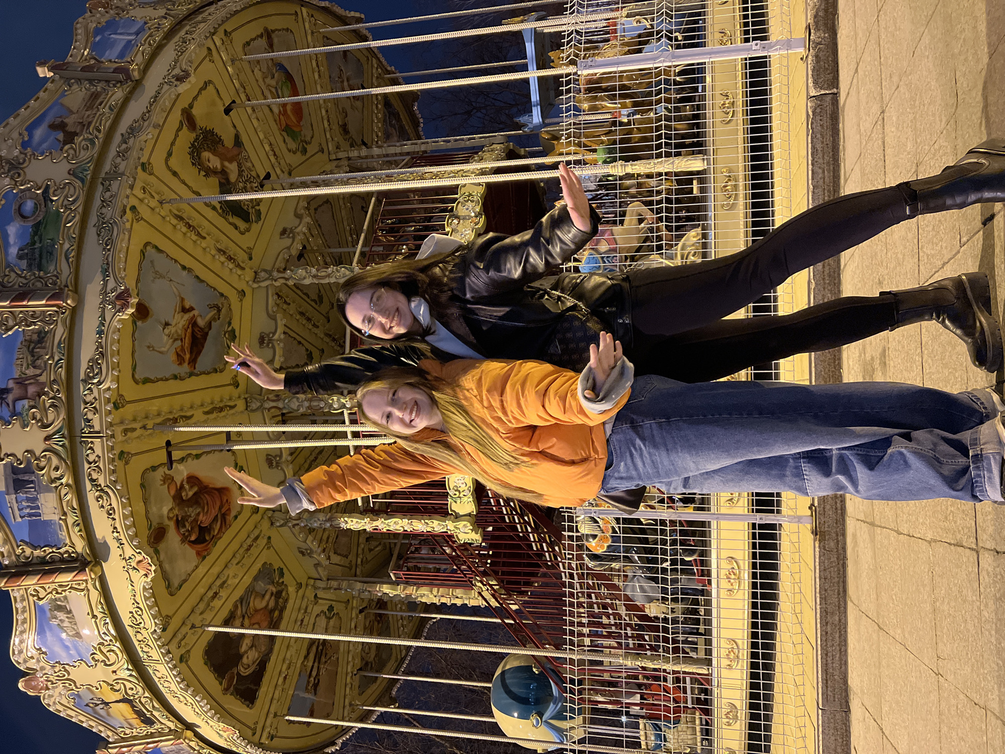 Two young women pose in front of a carousel. One woman wears a black leather jacket and black pants, while the other is wearing an orange puffy jacket and jeans. Both women have their arms outstretched and are smiling. The carousel behind them is decorated with paintings and ornate details. The ground is paved and there is a metal fence in front of the carousel. It appears to be a night scene. The location is the city of Tyumen, Russia.
