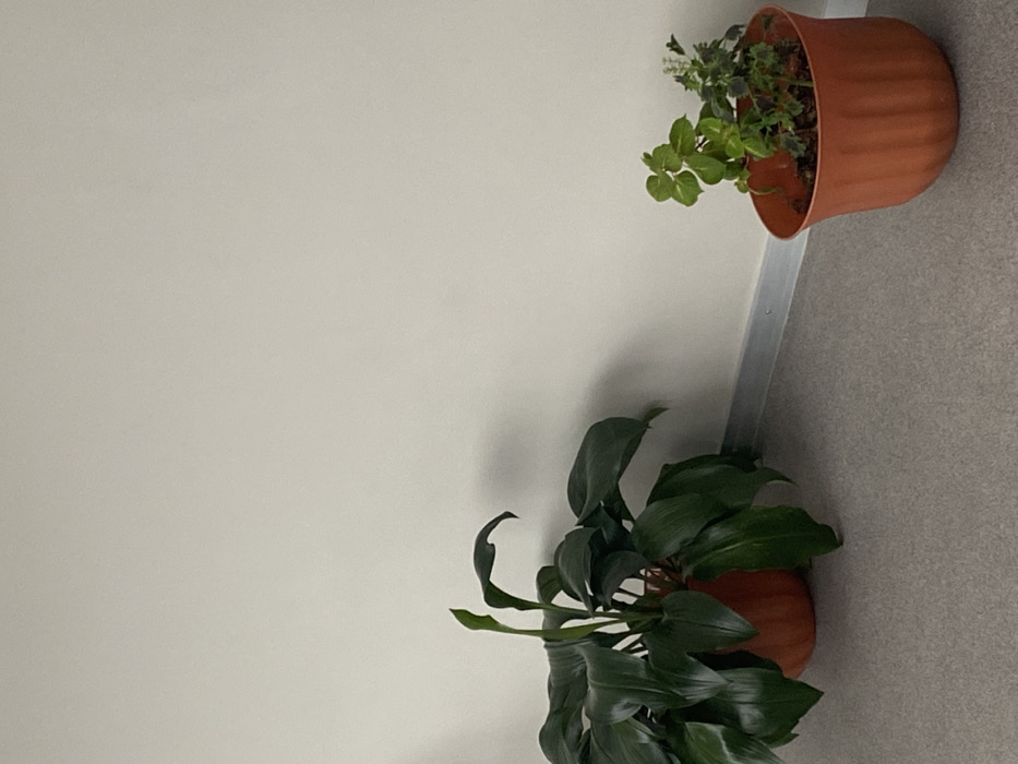 Two potted plants sit against a wall