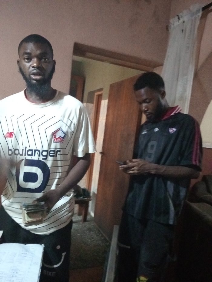 Two men stand indoors. The man on the left wears a white and blue sports jersey and holds a stack of cash. The man on the right wears a dark sports jersey with the number "9" and looks down at a mobile phone in his hands. A table with papers sits in the lower left, and a partially open doorway, curtains, and a couch are visible in the background.