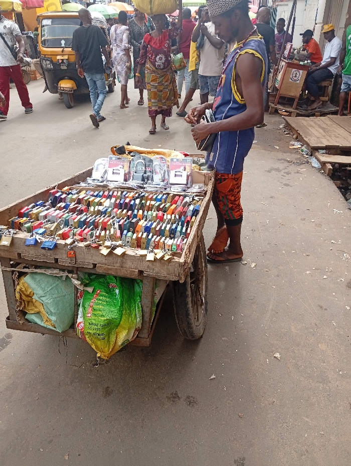 The image depicts a bustling street market scene in the city of Nkwelle, Nigeria. In the foreground, a dark-skinned male vendor stands barefoot in flip-flops, positioned to the right of a two-wheeled wooden pushcart. He wears a blue and yellow sleeveless jersey, orange patterned shorts, and a dark, patterned cap. His right hand is engaged with an object held over a small black bag or pouch. The wooden pushcart, approximately waist-height, serves as a display stand. Its top surface is densely covered with hundreds of small padlocks of various colors including gold, silver, red, blue, green, and black, arranged in orderly rows. Behind these, several larger, packaged padlocks are displayed. Beneath the cart, two large sacks—one green and one yellow/green—are stored. The background reveals a dynamic street environment. To the left, a grey paved road extends into the distance, occupied by multiple pedestrians and a yellow motorized trishaw (keke napep). Individuals walk in various directions, some carrying items on their heads. To the right, the ground transitions to a more irregular surface with wooden planks, suggesting makeshift structures or market stalls. Several individuals are visible in this area, including one seated person at a stall and others standing or walking. The overall scene is brightly lit by natural daylight, and the ground surface exhibits some dirt and debris.
