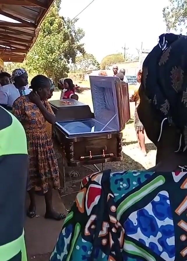 funeral service taking place outdoors. There is an open coffin on a stand, with people gathered around it, some looking inside. Most of the people appear to be women. One woman is wearing an orange and brown dress and is holding her face, seemingly in grief. The setting appears to be rural or suburban, with trees and houses visible in the background. The weather is sunny. The camera appears to be held by someone standing in the crowd.