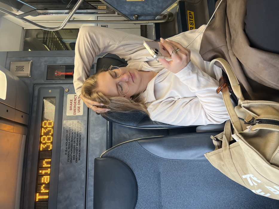 The image captures the interior of a commuter train, identified as "Train 3858" by an overhead LED display. Based on the signage and vehicle type common in the region, the location is a public transit train, consistent with NJ Transit services operating in or around Newark, United States. A Caucasian female with blonde hair, wearing eyeglasses and a light beige quarter-zip fleece top, occupies a dark blue fabric seat. She is actively engaged with a light-colored smartphone held in her left hand, her gaze directed downwards at the screen. Her right arm is raised, with her fingers resting in her hair. Multiple rings are visible on her right hand. Adjacent to her on the seat or floor is a light tan canvas tote bag, upon which rests a small, dark brown, segmented wooden figurine. The train's interior features grey wall panels, a visible emergency brake pull handle, and informational signage regarding emergency brake usage and door operation, indicating "IT IS A VIOLATION OF FEDERAL REGULATIONS FOR UNAUTHORIZED PERSON TO OPEN SIDE DOORS OR TO CAUSE EMERGENCY BRAKE APPLICATION WHEN NO EMERGENCY EXISTS." A yellow-marked step with the partial inscription "NEXT STEP" is visible to the right. The passenger appears to be traveling alone and is focused solely on her device.