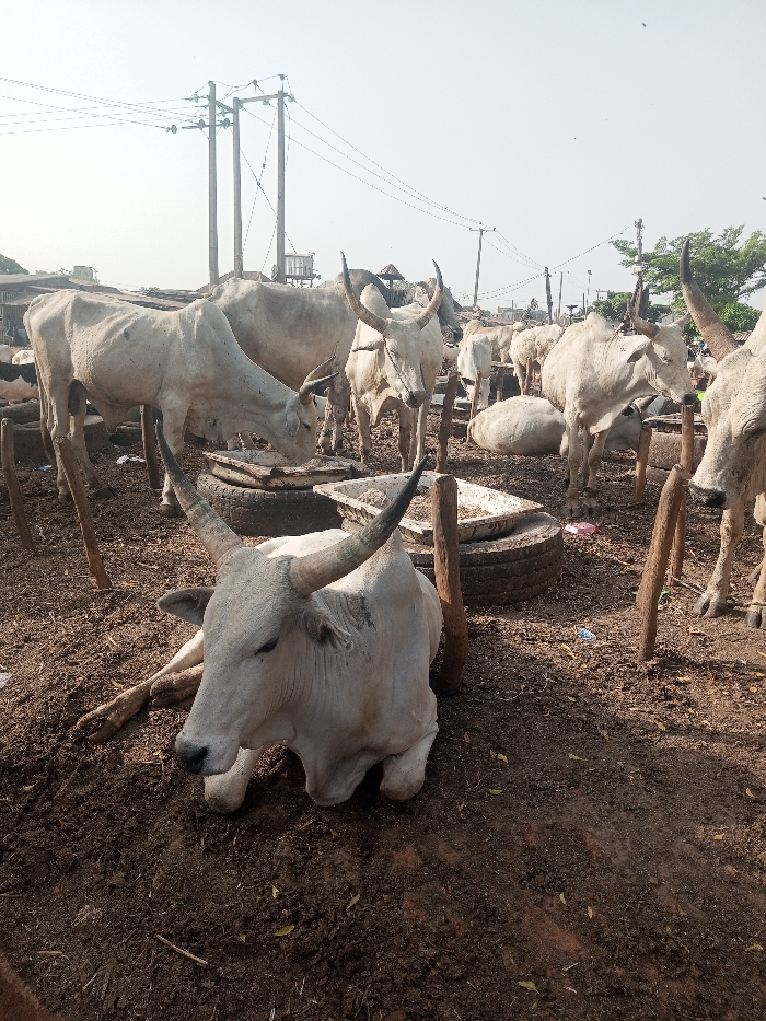 The scene depicts a cattle holding area in Sabon Gari North, Nigeria, under clear daylight conditions