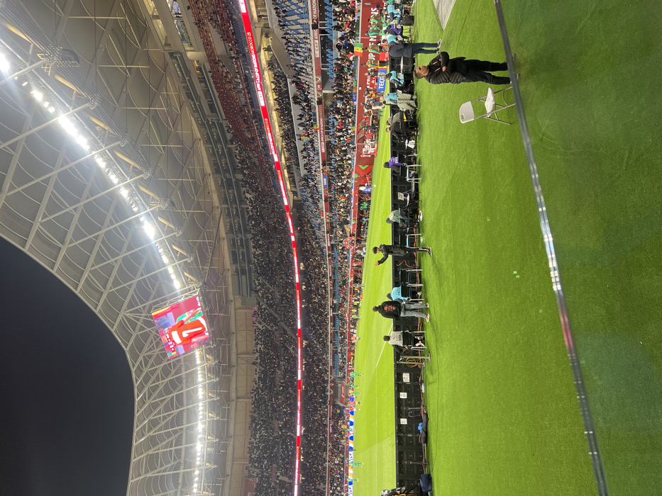 A packed stadium with a large video screen showing a graphic. A vibrant green soccer field sits adjacent to the stands. Along the sidelines, several individuals stand or sit on chairs. One man in a dark jacket is leaning over with his hands on the chair. A green wall lines the edge of the field, possibly separating the field from the spectator area.
