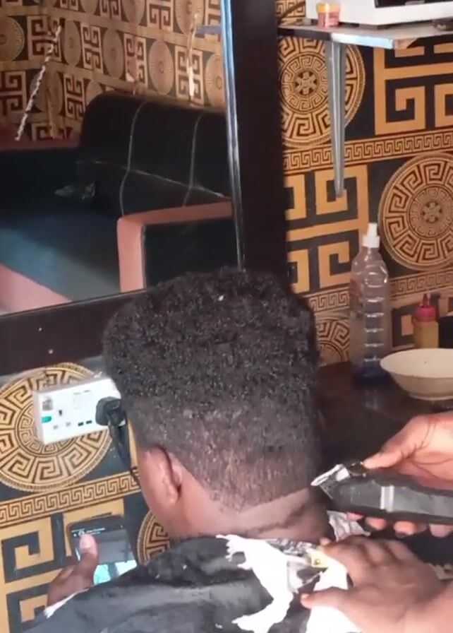 man getting a haircut in a barbershop. The barber is using a clipper to shape the back of the man's head. The man is looking at his phone while getting his hair cut. The barbershop has a mirror, a black leather sofa, and patterned wallpaper. The wallpaper has repeating geometric designs of gold and black. There is an electrical socket behind the man and a water bottle on the counter. The cape worn by the man being groomed is black and white.