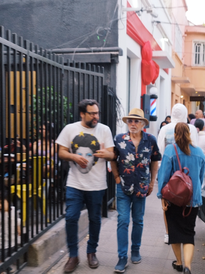 Two men walk on a sidewalk next to a black wrought iron fence, with a crowd of people behind them. The first man wears a white t-shirt with a face print, blue jeans, and brown shoes, while the other man wears a floral shirt, jeans, and a straw hat. A woman with a denim jacket and a red backpack walks in front of them. A barber pole is visible in the background near a building with red trim.