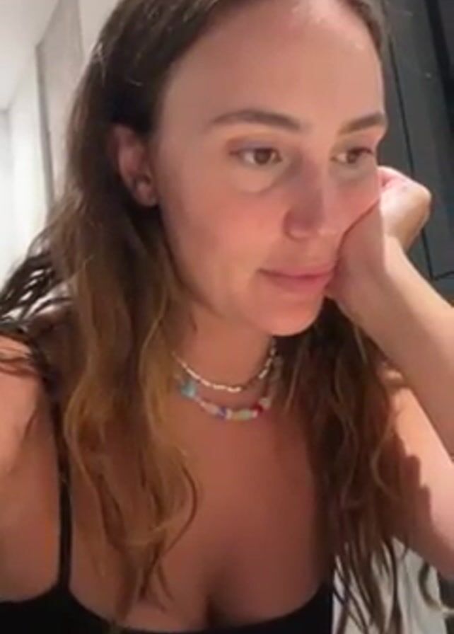 woman with long brown hair. She has a pale complexion and is wearing a black tank top and a beaded necklace. Her head is resting on her hand, and she appears to be looking at something off-screen. The background is a simple wall and a window.