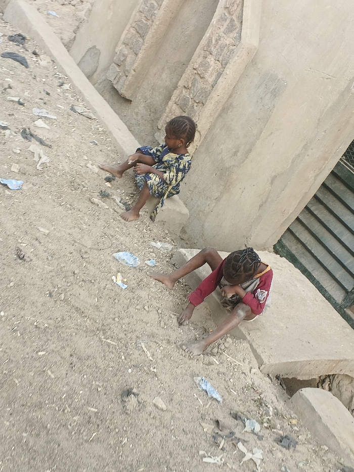 Two young individuals are observed in an outdoor, dusty environment in Kwachiri, Nigeria