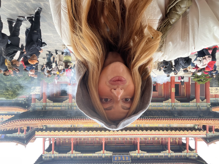 A female subject of Caucasian descent is positioned in the foreground, capturing a selfie