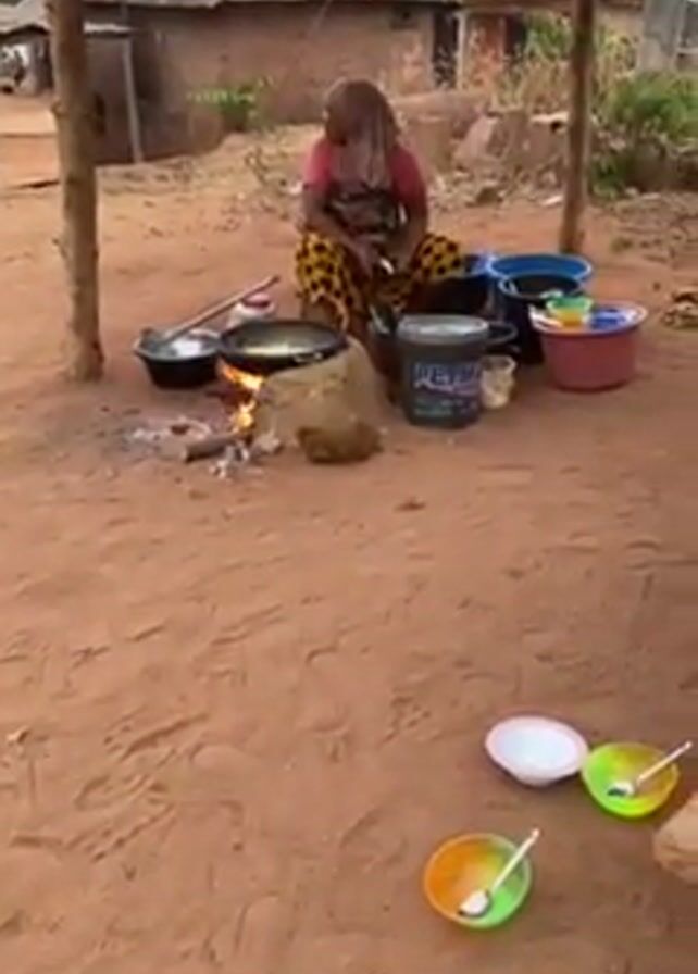 The scene depicts an outdoor cooking and dining area. In the background, a woman cooks over an open fire, using a large wok-like pan placed on a rudimentary stove made of stones. Several buckets and a container labeled "PETROL" are near her. In the foreground, three small bowls with spoons are set on the ground. A young man, wearing a black tunic and shorts, sits on a rough wooden bench, eating from a green bowl. A plate with fried food is also placed on the bench. A second person is standing behind him. The ground is reddish-brown soil. Several structures, possibly dwellings, are visible in the background, suggesting a rural or village setting.