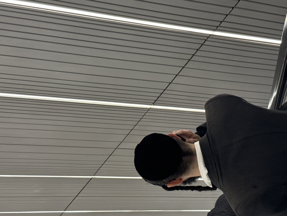 The image captures a male individual from behind, located in Bnei Brak, Israel, in what appears to be an indoor public or commercial building