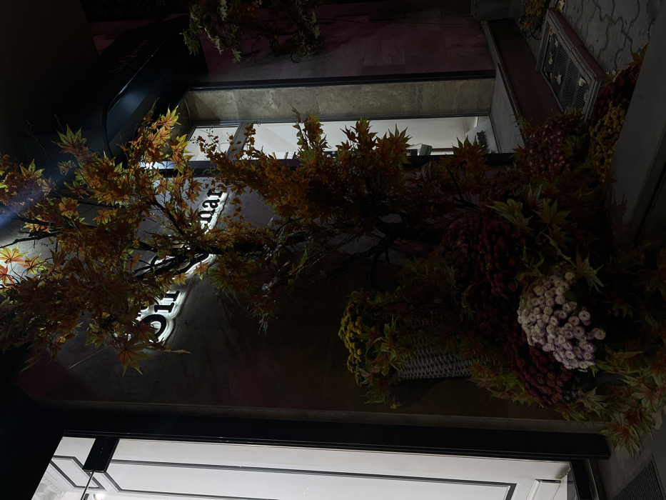 This nighttime image captures the exterior of a building entrance, identified by a prominent white neon sign displaying "Shoror," likely belonging to Shoror Restaurant & Lounge in Yerevan, Armenia. A large artificial tree with dense autumn foliage, featuring orange, yellow, and green leaves, stands centrally in front of a dark, paneled building facade. Below the tree, a floral arrangement includes a tall wicker basket filled with small yellow flowers, flanked by clusters of dark red/maroon and lighter pink/white chrysanthemum-like blooms at sidewalk level. To the left, a light-colored doorway with a black threshold is visible. To the right, a dark reflective glass window or door is present. The ground features a grey paved sidewalk with a rectangular metal grate in the lower right quadrant. An overhead dark awning extends above the illuminated "Shoror" sign. No individuals are present within the frame.