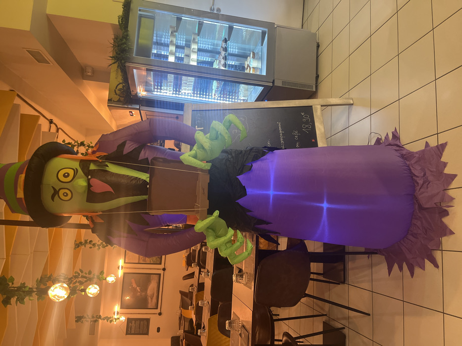An inflatable Halloween witch decoration stands upright in what appears to be a restaurant or café in Le Puy-en-Velay, France