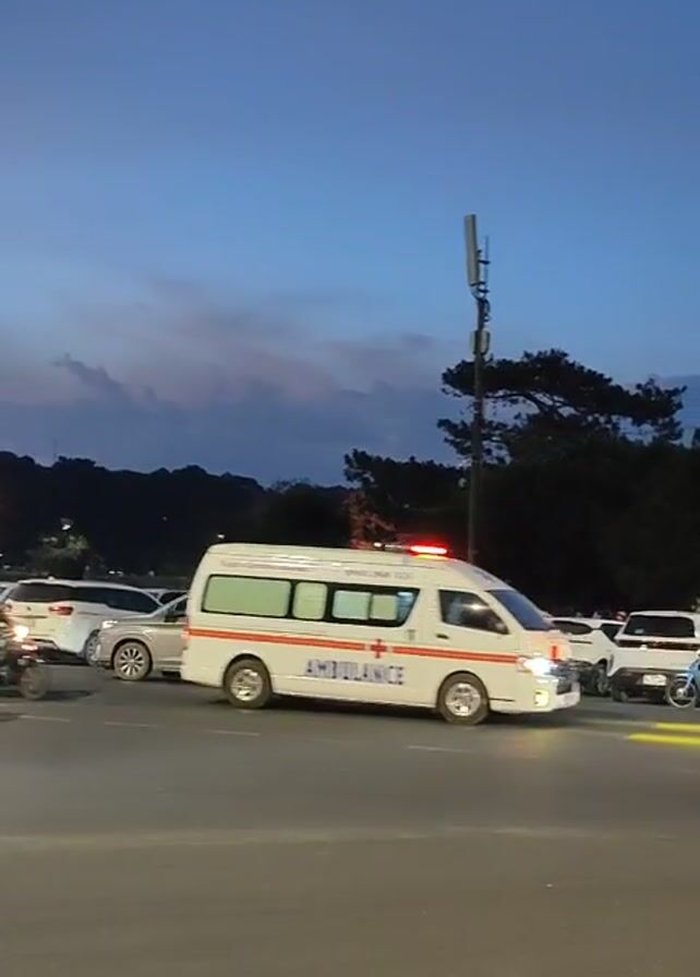 street scene in Vietnam at dusk. An ambulance is parked at the side of the road. There is a lot of traffic, including motorcycles and cars. People are walking on the sidewalks. The sky is a mix of blue, purple, and orange. The city skyline is visible in the distance.