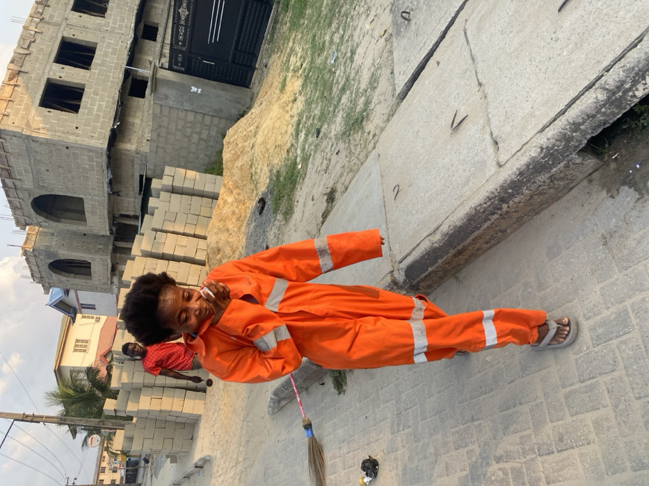 A woman in orange work overalls, reflective stripes, and sandals is lying on a paved surface. She rests her head on her hands and appears to wipe her face. A broom and trash are near her feet. Behind her is a stack of grey blocks next to a partly constructed building. A man in a red shirt stands in the background. A partially visible building and palm tree are also visible.