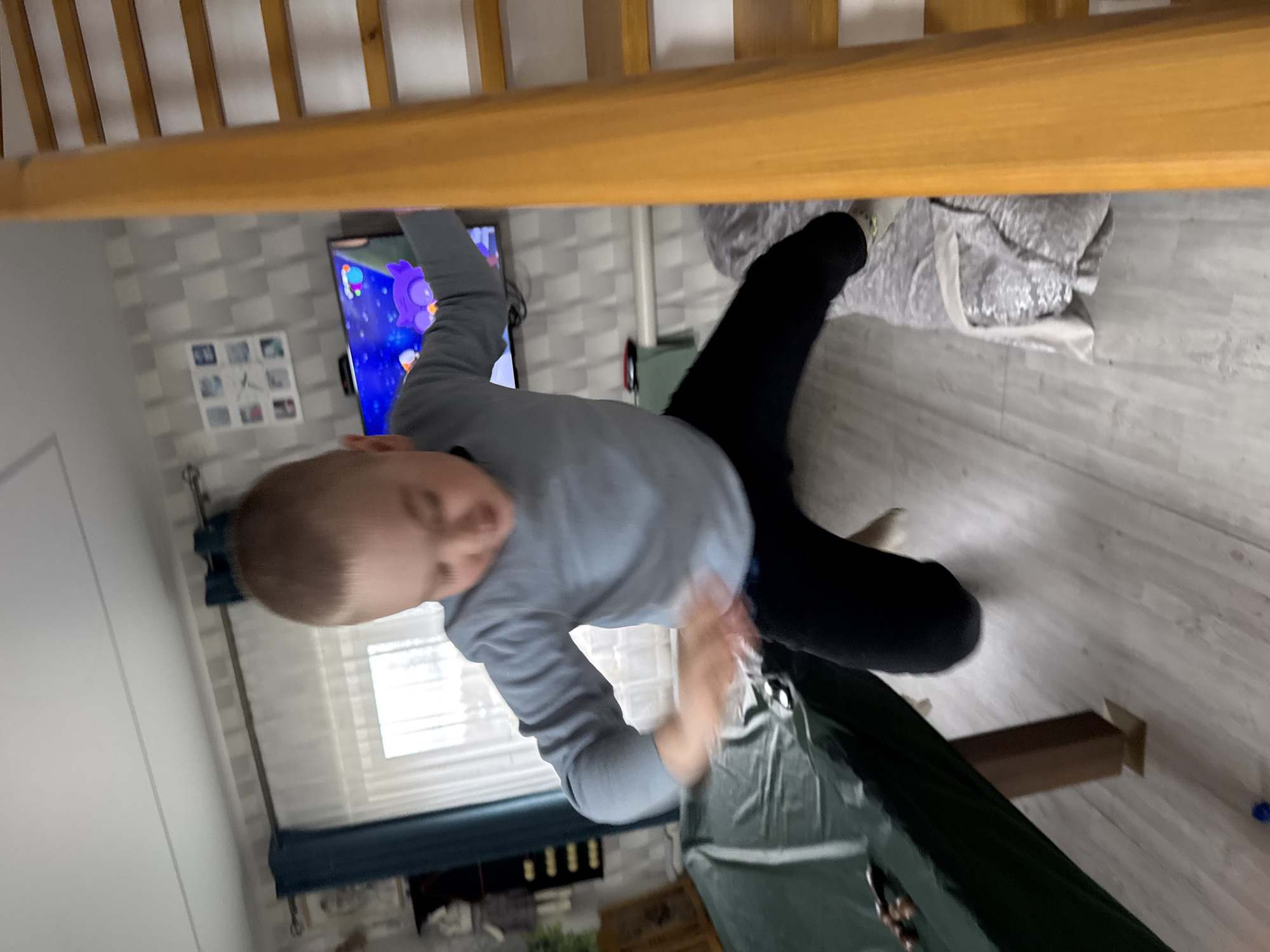 A young boy, seemingly suspended in mid-air or in a state of falling, is the central subject. He is dressed in a long-sleeved grey shirt and black pants. The setting appears to be inside a room with a bed frame visible at the top of the frame and a window in the background. A television screen can be seen in the background showing an animated character or scene. The presence of a green tarp or similar material suggests possible construction or renovation activity. The location is Zhigalki, Russia.