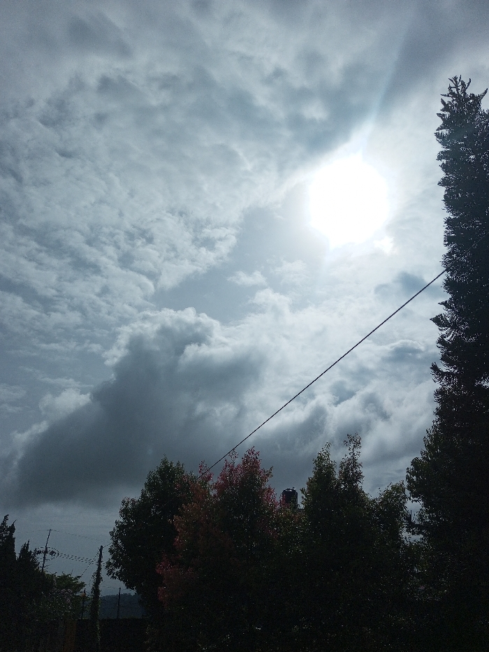 A bright sun fights its way through a cloudy sky, casting a hazy glow. A single, taut power line cuts diagonally across the frame. In the lower portion, a mixture of green and reddish-leaved trees obscures the horizon. A hint of a building structure peeks through the vegetation. The overall impression is one of unsettled weather and obscured visibility.