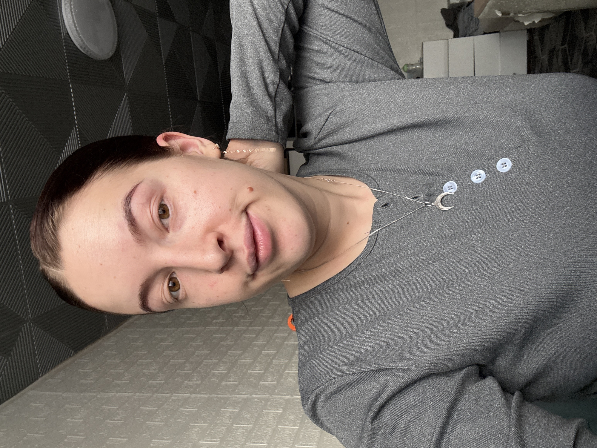 A woman with brown hair and eyes is wearing a gray long-sleeved shirt and a silver necklace with a crescent moon pendant. She is indoors. The background includes a wall with a geometric pattern and furniture. There is no information in the image to confirm a location in the city of Donetsk, Ukraine.