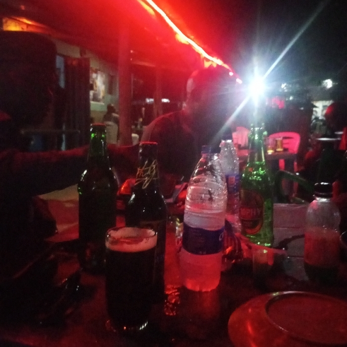 A low-light scene is depicted within an establishment, likely a bar or lounge, in Sauka, Nigeria. The environment is predominantly illuminated by red string or strip lighting overhead, casting a reddish hue across the area. Several individuals are present. In the foreground, two figures are seated at a table, largely silhouetted. One figure is positioned to the left, partially visible. Another figure, positioned right of center, is also a dark silhouette, with a very bright light source creating significant lens flare near their head. The table in the foreground holds multiple beverage containers: a clear glass filled with a dark liquid (consistent with beer), at least two green glass beer bottles (one identifiable as "Trophy"), one dark glass beer bottle (partially identifiable as "Hero"), and several plastic water bottles, some containing water. A smaller clear bottle and a reddish-brown circular object, possibly an ashtray or dish, are also on the table. Additional blurred figures are visible in the dimly lit background.