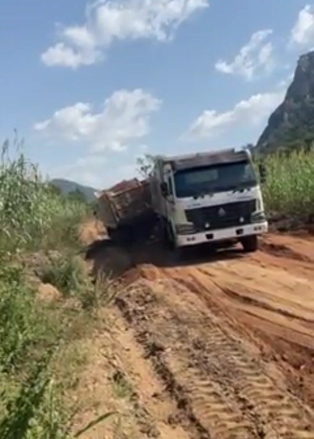 white, old dump truck moving on a dirt road. It is carrying a load of reddish-brown material. The road is muddy with deep tire tracks. The truck appears to be struggling on the uneven surface, leaning to one side. A person on a scooter passes on the side of the road. The environment includes green vegetation, trees, and a mountain in the background. The sky is blue with some clouds.