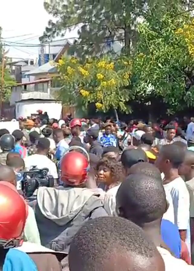 A large crowd of people, mostly African, stands in the middle of a street. Many are wearing hats or helmets. Some are wearing colorful clothing. There are buildings and trees in the background. The crowd appears to be a gathering, possibly a protest or demonstration. The day is sunny.