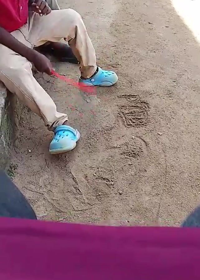 A young child, wearing a red shirt, khaki pants, and light blue Crocs, sits on the edge of a concrete surface, on the ground. He uses a red stick to draw in the sand. A second child, also in a red shirt, is sitting next to him. A brown coconut rests on the ground nearby. The camera is positioned low, showing the legs of the person recording. The background consists of dirt and concrete.