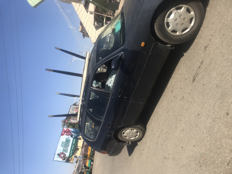 A dark-colored station wagon sits on a paved road under a clear, blue sky