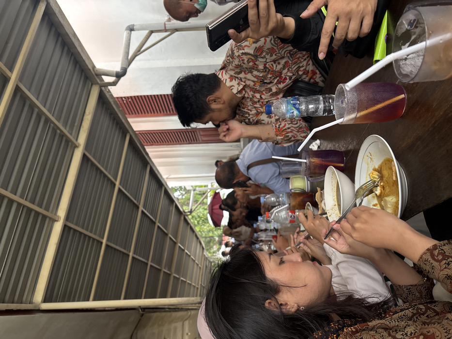 People are gathered around a long wooden table, enjoying a meal. Plates with leftover food, drinks with straws, and water bottles are scattered across the table. Some people are using their phones, while others are engaged in conversation. A woman is in the foreground, holding utensils and seemingly about to eat. An awning structure covers the space, creating a shaded area for the diners.