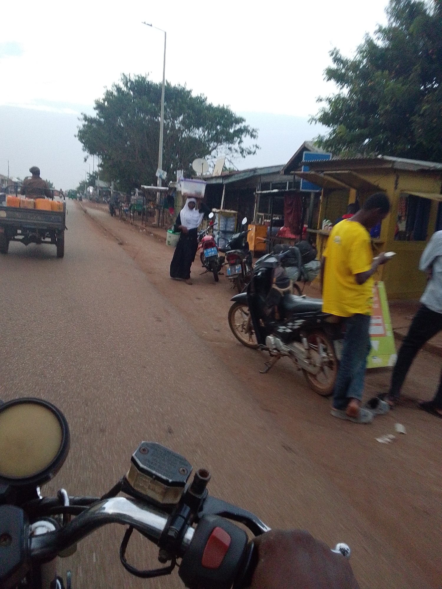 street scene in what appears to be a developing urban area. A dirt road is visible in the foreground, with the handlebars and instrument panel of a motorcycle present, suggesting the image was taken from the perspective of a motorcycle rider. A tractor is seen on the road carrying tanks. On the side of the road, there are several people, some standing and others near parked motorcycles. One individual wears a yellow shirt and appears to be looking at a mobile device. A person in dark clothing, a white headscarf, and carrying a container on their head is also visible. There are structures along the road that seem to be small shops or stalls. A utility pole stands tall, adding to the infrastructure. The sky is overcast, which suggests the photo was taken during a time when weather conditions were not clear.