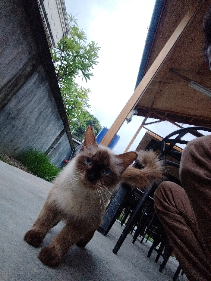 - "An outdoor scene in Lhokseumawe, Indonesia, features a cream-colored cat with dark brown points (face, ears, paws, tail tip) and distinct blue eyes" by FM-vhmNj2, licensed under CC BY 4.0