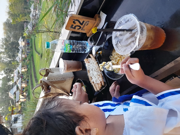 The image captures an outdoor dining scene in Penanggungan, Indonesia. In the foreground, a young child with dark hair and a gold earring, wearing a white and blue striped garment, is seen in profile, holding a silver fork with instant noodles from a black bowl. Partially visible hands of an adult are also present, near a similar black bowl. The dark, reflective tabletop holds an amber-colored iced beverage in a plastic cup with a straw decorated with a small yellow flower, a brown iced beverage in another plastic cup, a 'Cheers' brand bottled water, and a black rectangular plate containing fried items topped with shredded white cheese. A beige woven handbag and a wooden sign displaying "52 ANTASENA KORA" are also on the table. The background reveals a landscape of verdant terraced rice paddies, interspersed with numerous small, light-roofed huts or gazebos. Lush green foliage and a hazy sky complete the outdoor setting.