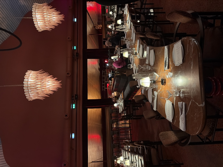 A warm-toned room features a long dining table set for a meal. Elegant tableware, including glassware and menus, adorns the marble-patterned surface. Soft lighting comes from small lamps on the table and decorative chandeliers hanging from the ceiling. People are seated along the table, creating an intimate ambiance. Dark chairs are positioned along the sides. The background showcases a red curtained stage-like setting, adding a theatrical flair.
